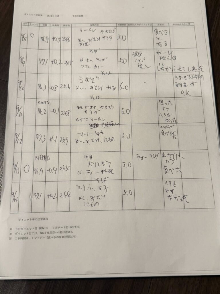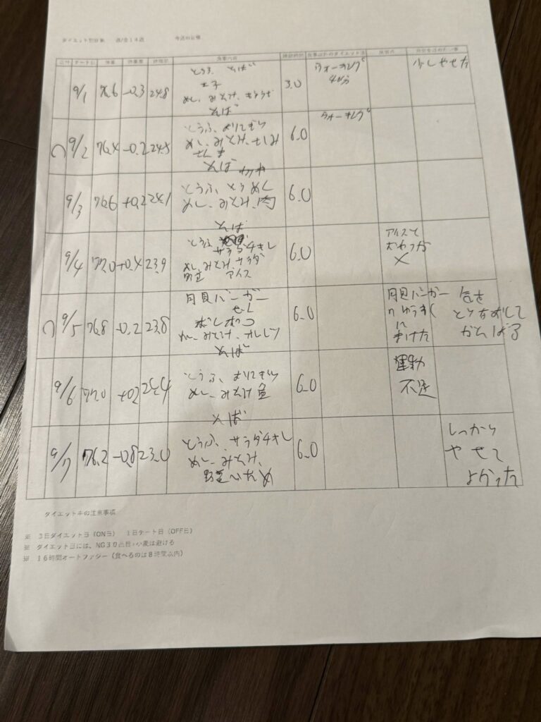 自分の記録を紙に書いて確認する事で、体重を減る行動を続けるモチベーションになりますね。