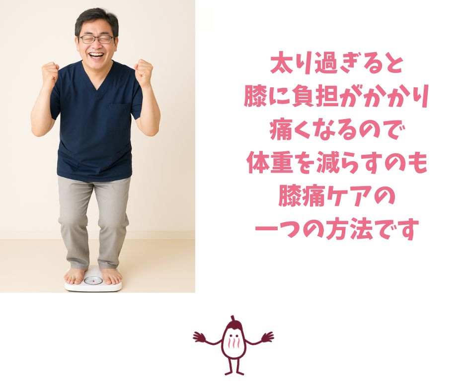 食事療法を組み合わせ、体重を落としていくと膝痛も軽減。