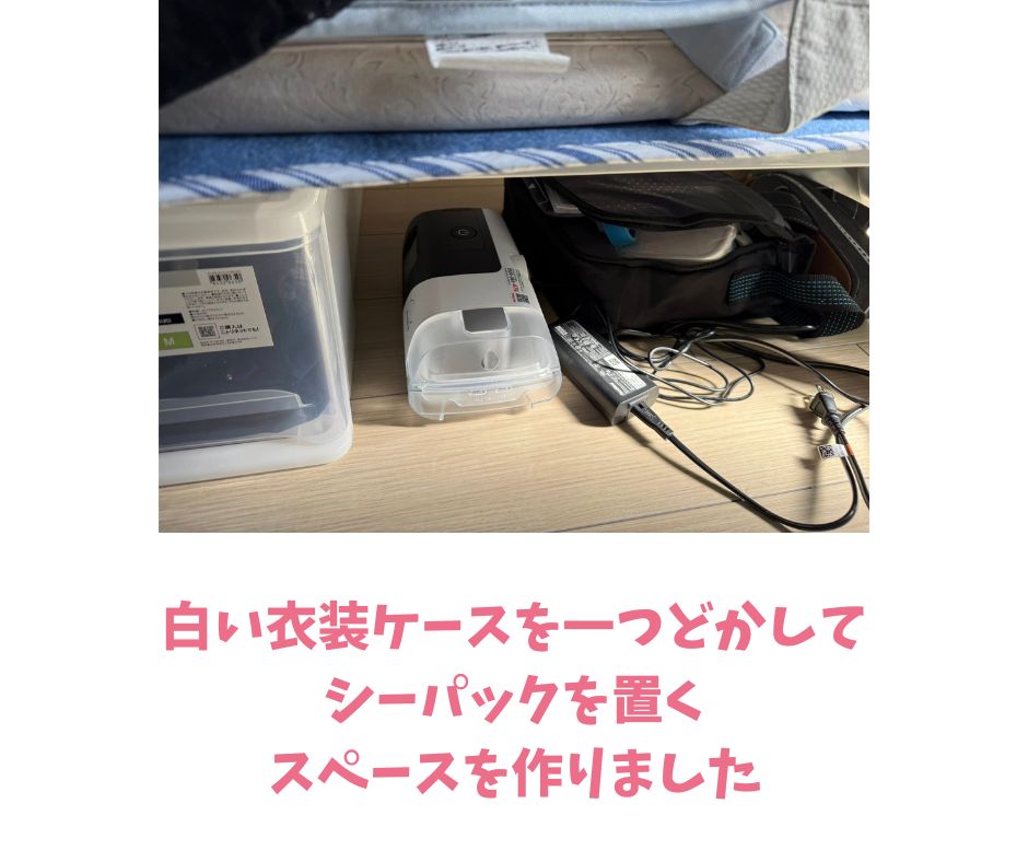 シーパックの機械が意外に大きいので、ベッド下の幅44センチの衣装ケースを一つどかしてスペース確保しました。