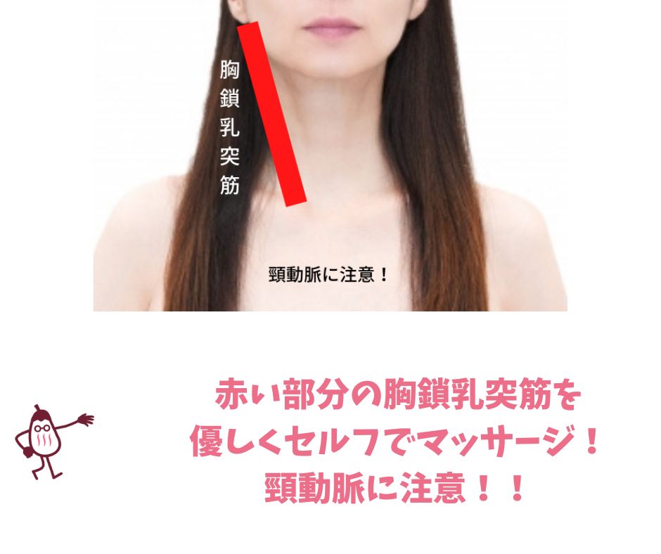 首の胸鎖乳突筋辺りを、優しくマッサージしたりさすったりしたください。