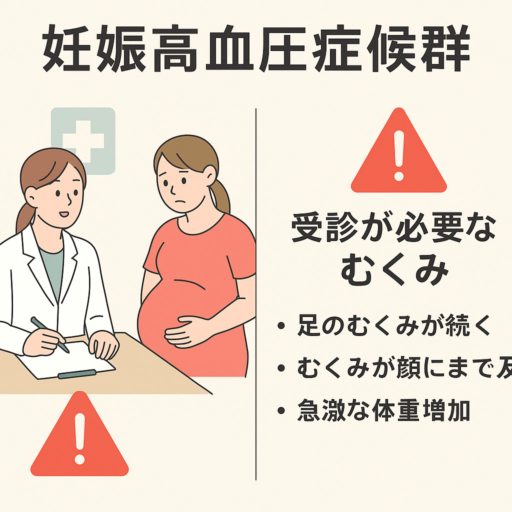むくみのほとんどは生理的なものですが、まれに病気が原因のむくみもあります。代表例が「妊娠高血圧症候群」です。