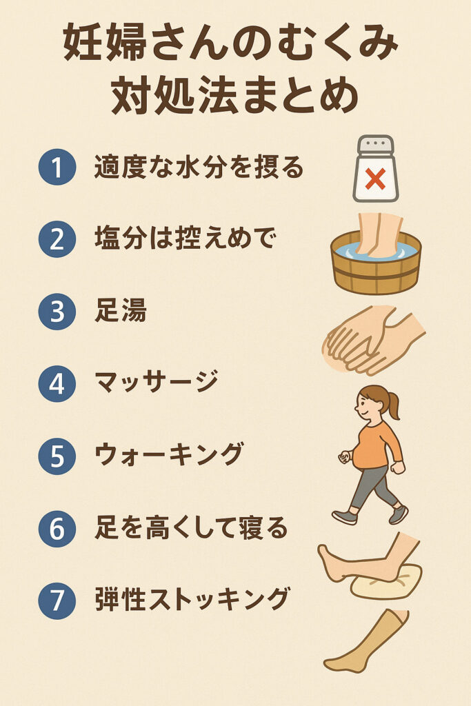 - 対処法は「水分補給・塩分控えめ・足湯・マッサージ・ウォーキング・足を高く・弾性ストッキング」