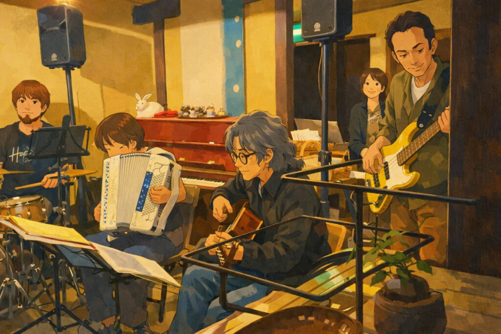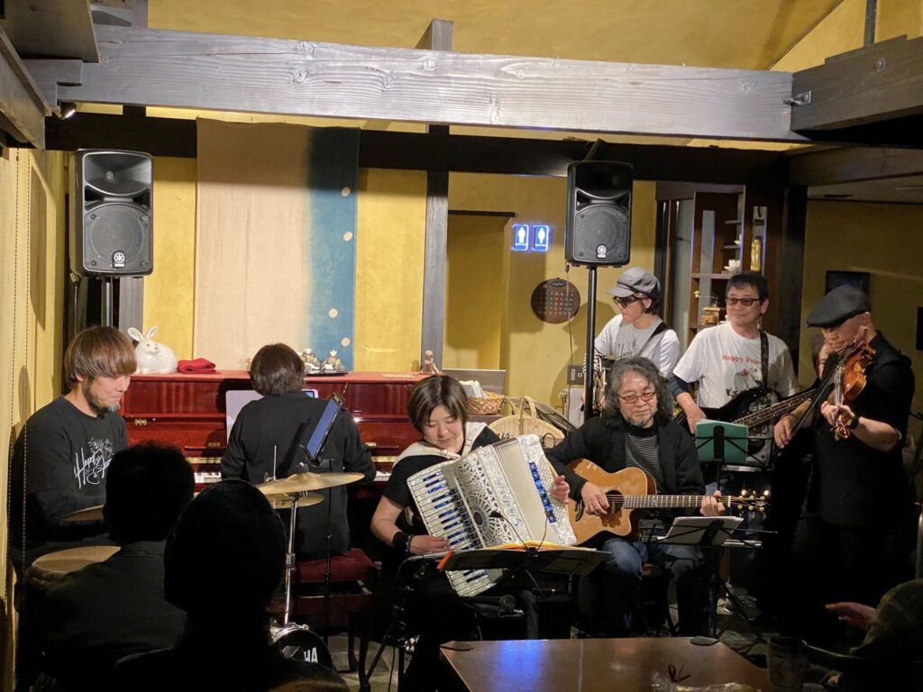 たかみさんのアコーディオンと、丸茂先生のギターと、マッキー先生のドラムと合わせました。