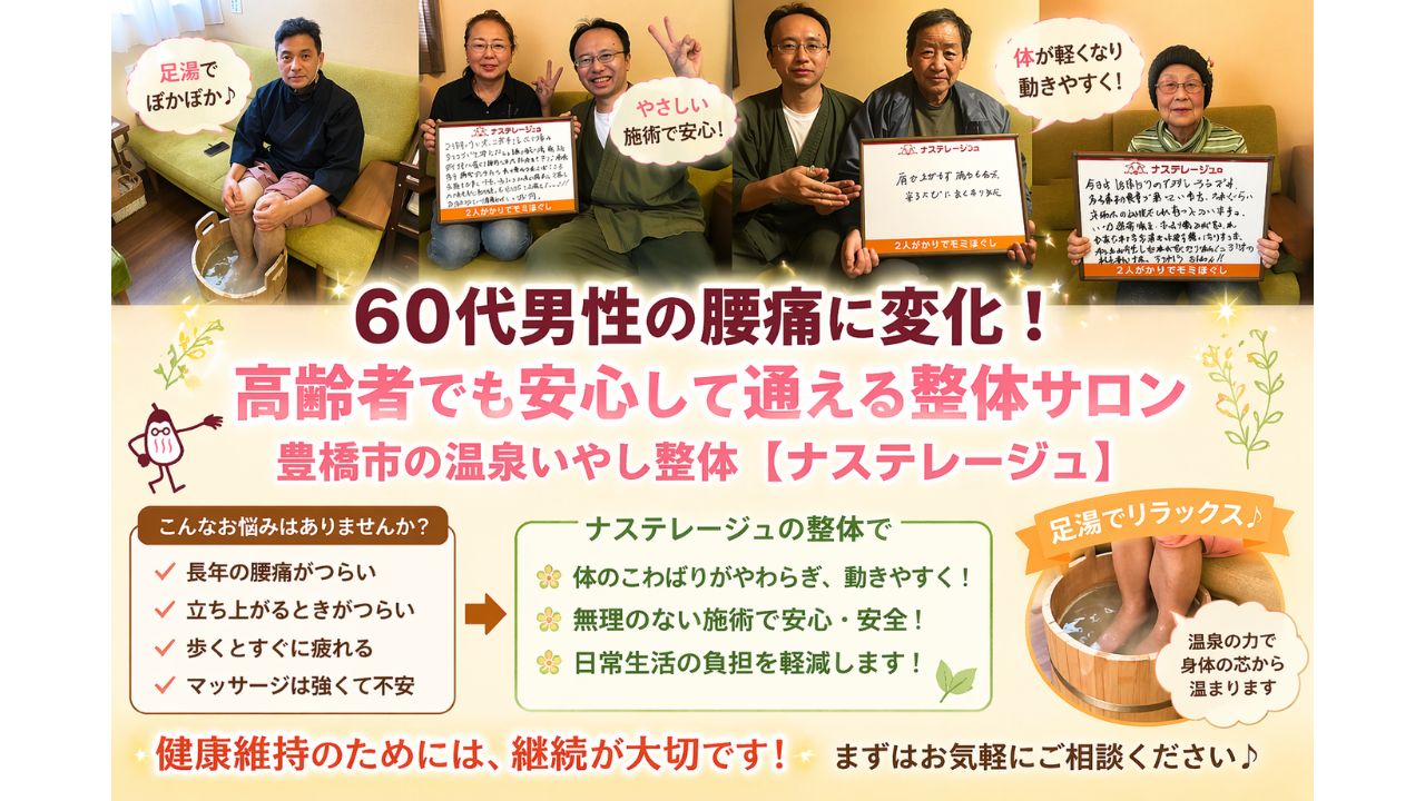 60代男性の腰痛に変化!高齢者でも安心して通える豊橋市の温泉いやし整体【ナステレージュ】とは